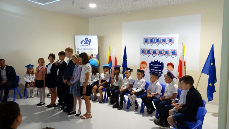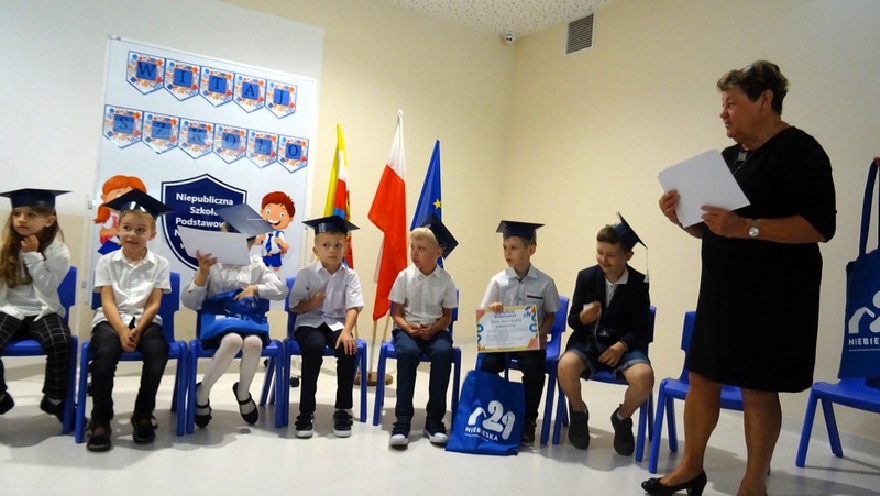 Początek roku szkolnego to ważne wydarzenie w życiu każdego ucznia i nauczyciela. To szczególny moment w życiu szkoły oraz czas rozpoczęcia nowej intelektualnej przygody. W słoneczny poniedziałek 4 września 2023 br., w Niepublicznej Szkole Podstawowej „Niebieska 21” odbyło się uroczyste rozpoczęcie roku szkolnego 2023/2024. Na sali gimnastycznej o godz. 09.30 zebrali się uczniowie wszystkich klas, nauczyciele, terapeuci i specjaliści oraz rodzice. Po uroczystym odśpiewaniu hymnu państwowego uroczystego rozpoczęcia roku szkolnego dokonała Pani Dyrektor - Grażyna Gregorczyk, witając zaproszonych gości, rodziców, pracowników szkoły oraz uczniów, a szczególności pierwszoklasistów, wkraczających w mury naszej placówki.