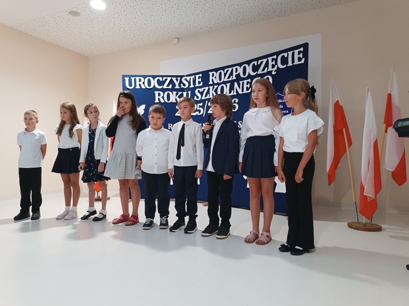 Uroczystość rozpoczęła się od odśpiewania hymnu narodowego. Następnie uczennice Ania Ś. oraz Iga Ś. w roli narratorów przywitały nauczycieli, rodziców oraz uczniów w szczególności tych, którzy po raz pierwszy przekroczyli szkolne mury i przyjęli pasowanie oraz ślubowanie.